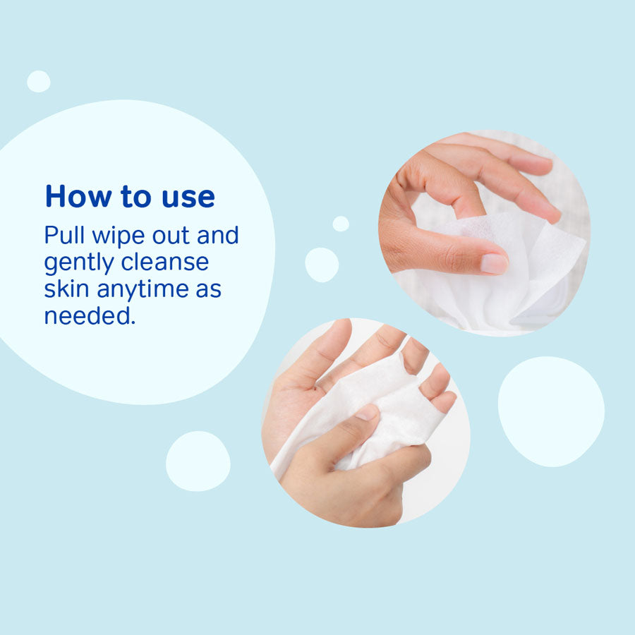 Pull the wet wipe out, and gently cleanse skin anytime as needed