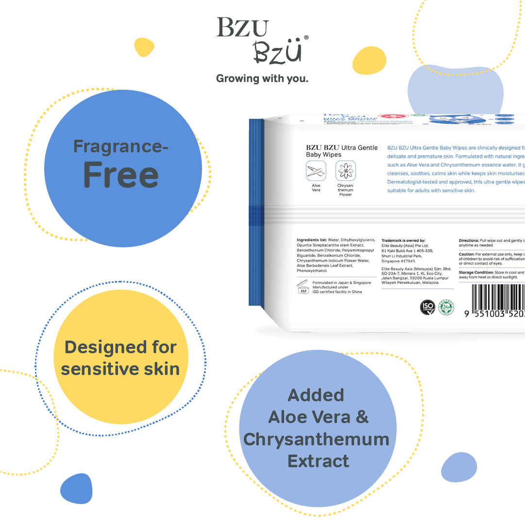 BZU BZU Ultra Gentle Baby Wipes are designed for delicate and premature skin. Formulated with natural ingredients such as Aloe Vera and Chrysanthemum essence water. It gently cleanses, soothes, calms skin while keeping skin moisturized. Dermatologist tested and approved, this Ultra Gentle Baby Wipes are also suitable for adults with sensitive skin.